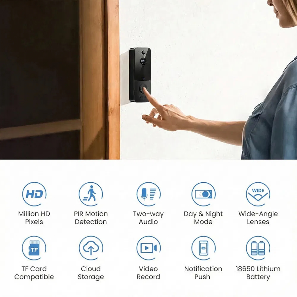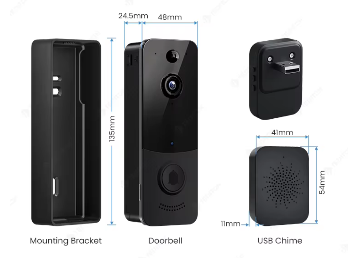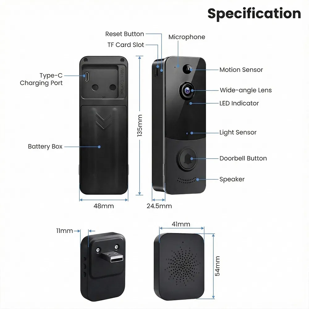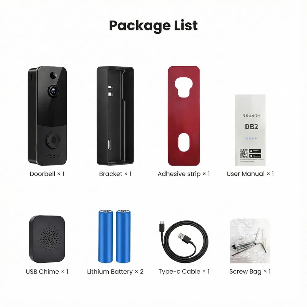 Η συσκευασία περιλαμβάνει ασύρματο USB Chime (κουδούνι) που συνδέεται σε οποιαδήποτε πρίζα USB στο σπίτι σας — δεν χρειάζεται καλωδίωση. Αποθηκεύει βίντεο σε κάρτα TF έως 128GB ή στο Cloud (προαιρετικά).